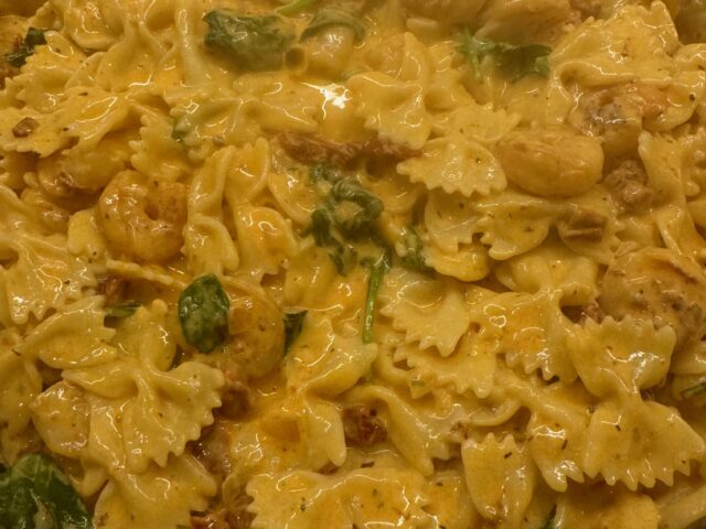 SoolanePane krevetid kaussi ja maitsesta 1/2 tl paprika pulbri, 1/2 tl soola ja natukese pipraga. Sega korralikult läbi ja pruunista pannil päikesekuivatatud tomatite õliga ning tõsta jahtuma. Keeda pasta. Sulata …
