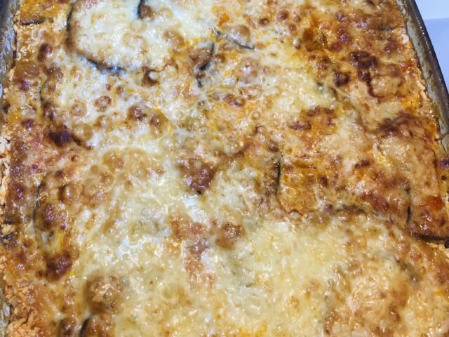 Soolane· 1 suurem baklazaan · 900 g kanahakkliha · 600 g riivjuustu · 300 g tomatipastat · 200 g toidukoort · 1 sibul · 2 küüslauguküünt · soola · pipart …