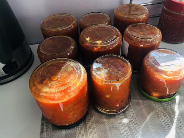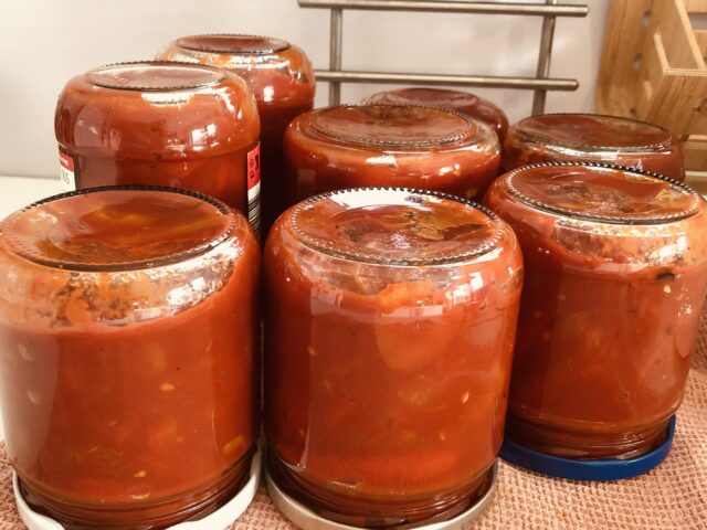 1 kg tomateid 1 kg paprikat 2 sibulat 3 tl soola 15 tl suhkurt küüslauk 2 spl äädikat 300 gr tomatipastat Lõigu kõik ained ribadeks, pruunista eraldi pannil ca 15 …
