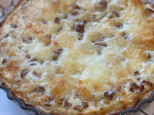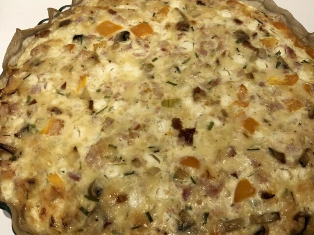 PÕHI 100g võid 150g jahu 50g riivjuustu soola 50ml vett KATE 400G kukeseeni 130-150 g suitsupeekonit 1 suurem sibul 200g riivjuustu 200 g kohvikoort 2 muna soola ja valget pipart …