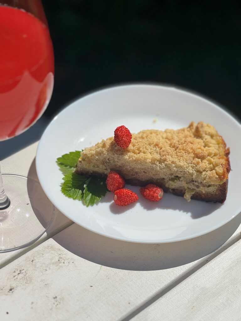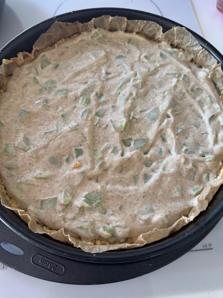Sega 50 g suhkurt, munad, kohupiimad, tükeldatud rabarber ja kaneel ning vala küpsetatud põhjale.