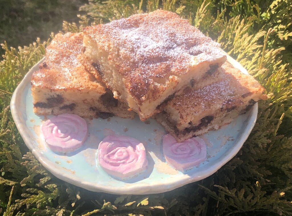 Segada juurde õun või rabarber ja soovi korral sokolaadi tükid. Valada küpsetuspaberiga kaetud ahjuplaadile. Raputa peale suhkur ja kaneel.