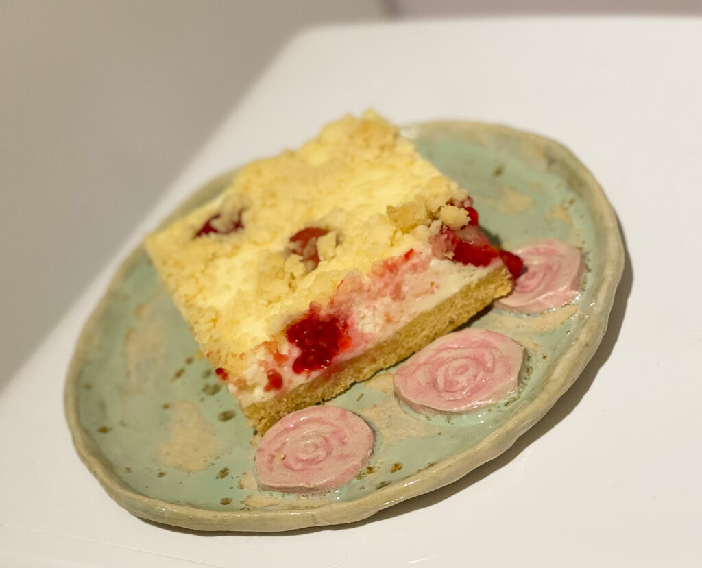 KATE- Sega omavahel kõik komponendid peale vaarikate, vala kõpsetatud põhja peale. Laota vaarikad. Mina vajutasin sõrme otsaga vaarikad kohupiima massi sisse. Puista peale puru. Küpseta 200 kraadi juures 25 minutit.