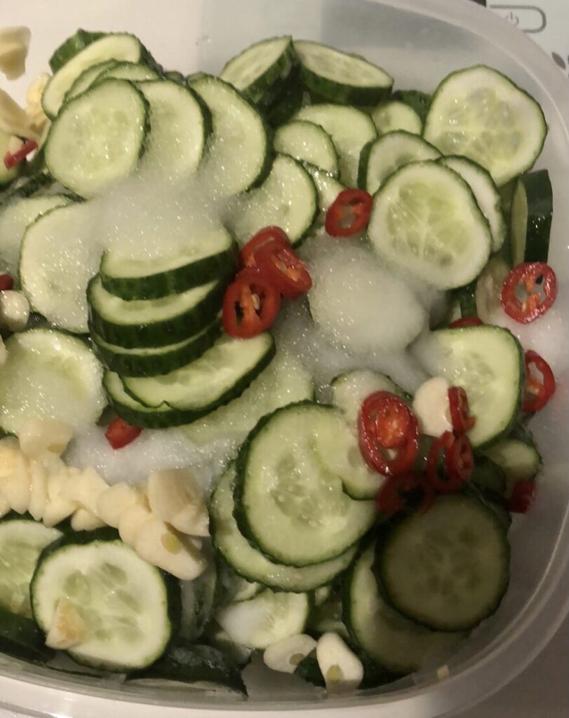 Viiluta kurgid, seda kõik komponendid kokku ja pane külma. hommikul purkidesse. Säilib külmkapis paar nädalat. Sobib ka kohe peale kokku segamist söömiseks.