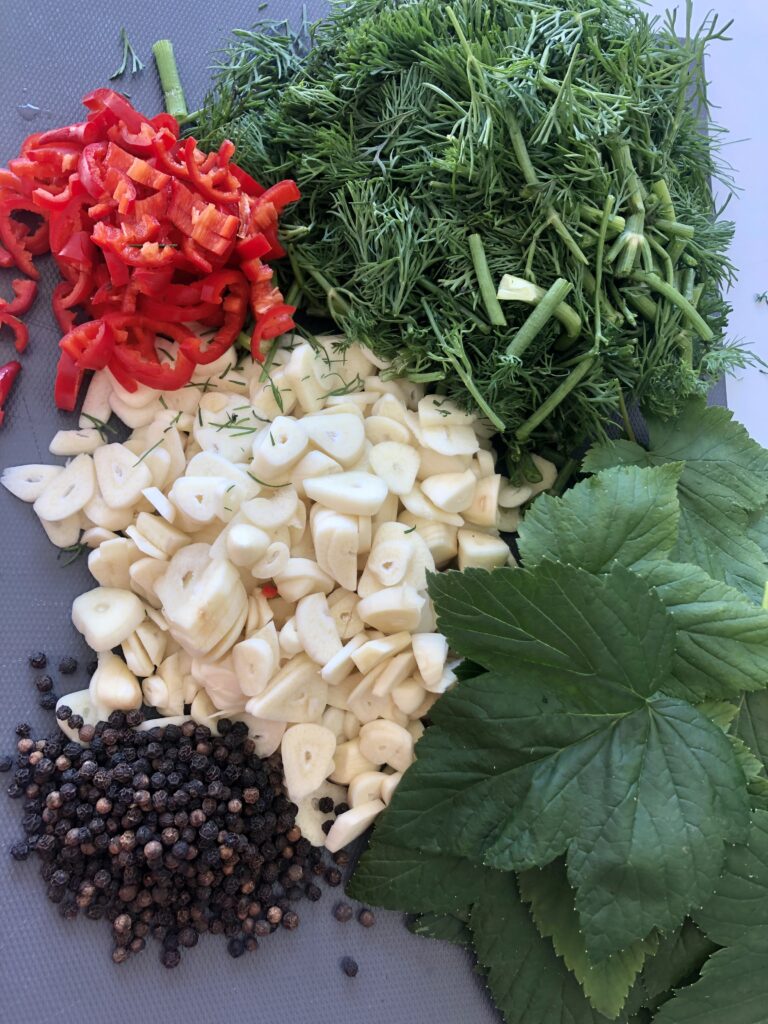 Tükelda küüslauk, chilli ja till ning pane purkide põhja koos mustsõstra lehtede ja terapipraga. Kogused pane vastavalt oma maitsele.