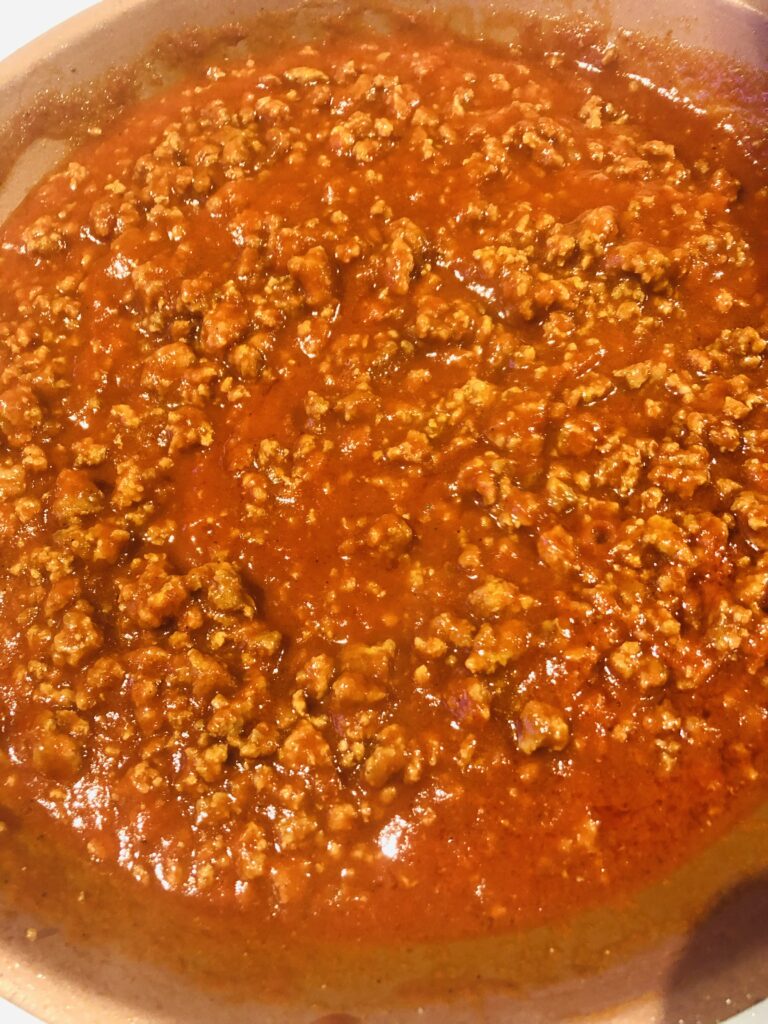 Prae hakkliha, maitsesta soola ja pipraga. Kui hakkliha on praetud pane pliidil kuumus väiksemaks ja lisa tomatipasta, lisa vajadusel veidi suhkurt.