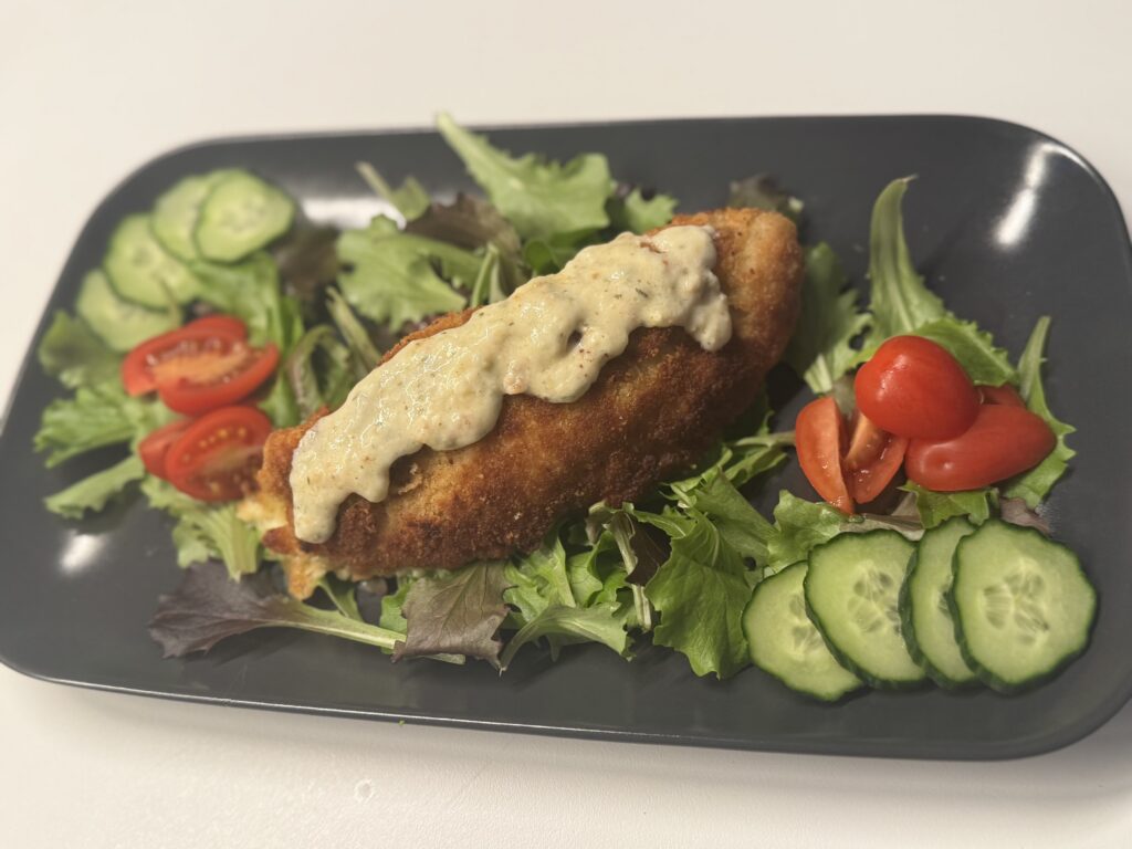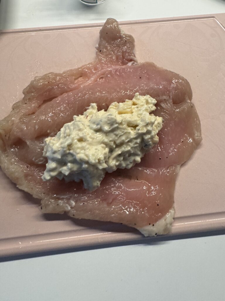 Pane kanafilee keskele juustusegu ja keera kanafilee rulliks.