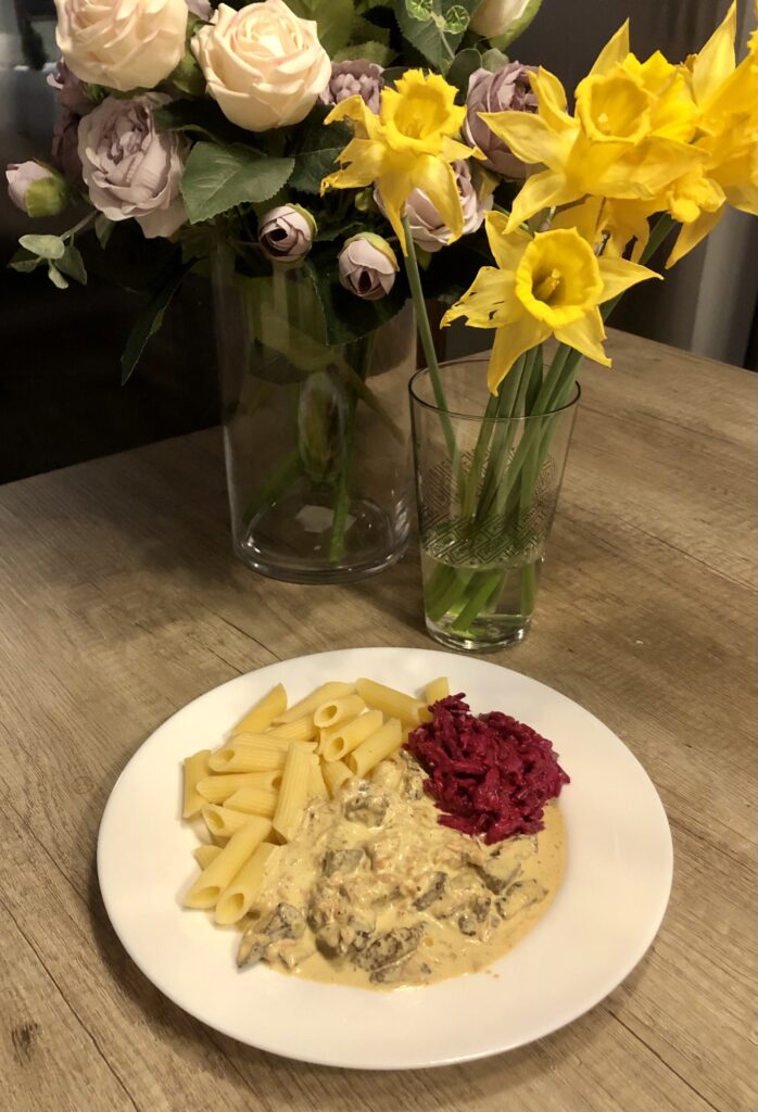 Tükelda maks ja prae kuumal pannil. Kui maks on pruunistunud lisa tükeldatud sibul ja riivitud porgand, prae veel kuni sibul klaasjas ja porgand pehme. Maitsesta soola ja pipraga. Lisa kohvikoor ja sega, seejärel lisa hapukoor ja sega hoolikalt. Keera pliidil kuumus kinni.