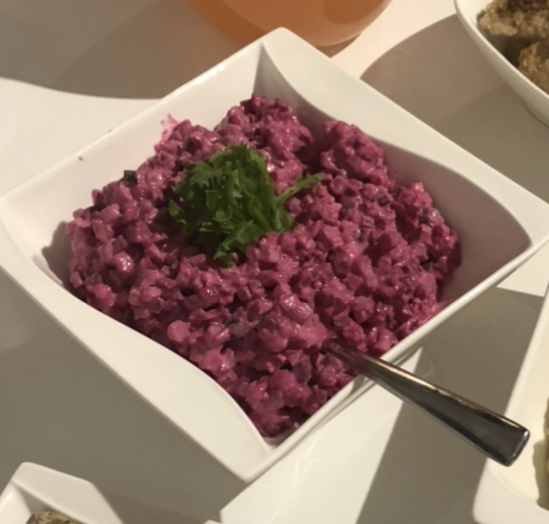 Maitsesta liha ja küpseta ahjus. Keeda kartul ja muna ning lase jahtuda. Tükelda kõik komponendid väikesteks kuubikuteks. Sega majoneesi ja hapukoorega. Maitsesta soolaga. Lisa ca 6 cm sinepit ja teelusika otsatäis suhkurt.