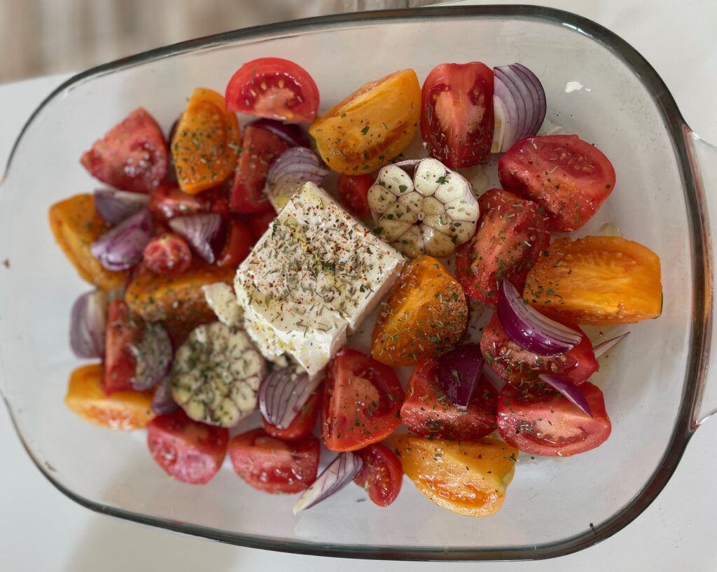 Pese ja tükelda ahjupotti tomat ja paprika. Koori sibul ja lõika sektoriteks ning pane ahjupotti. Poolita küüslauk ja lisa teiste asjade juurde. Lisa ka fetajuust. Maitsesta soola, chillihelveste ja rosmariiniga.